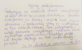 Bardzo nas cieszą takie dowody uznania i wdzięczności pacjentów naszego Szpitala, jak te, które otrzymaliśmy w ostatnich dniach. Tym razem docenieni zostali lekarze, pielęgniarki i cały personel medyczny Oddziału Klinicznego Chorób Wewnętrznych i Gerontokardiologii. Jest nam miło, że pobyt w Oddziale spełnił oczekiwania naszych pacjentów, a za ciepłe słowa SERDECZNIE DZIĘKUJEMY.